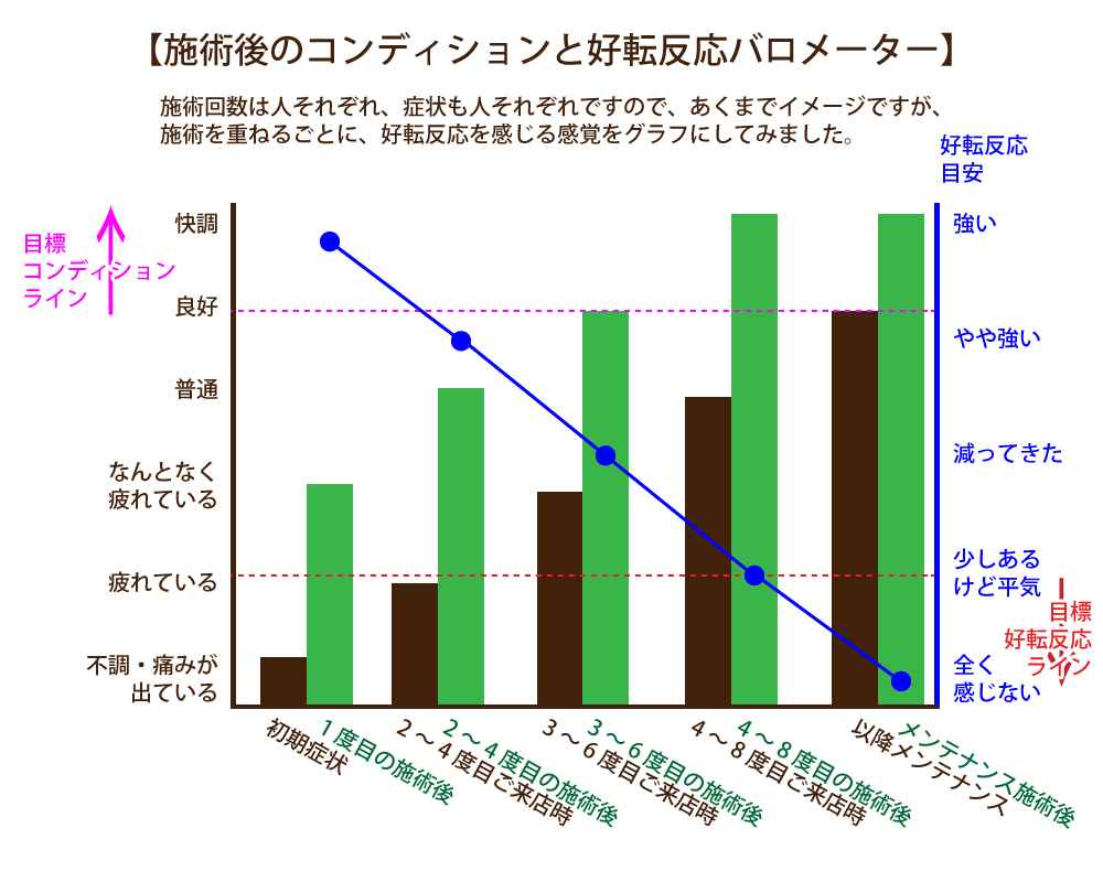 ご利用回数目安と『好転反応』目安。施術後の身体の変化についてブログ更新しました。公式サイトをご覧ください。