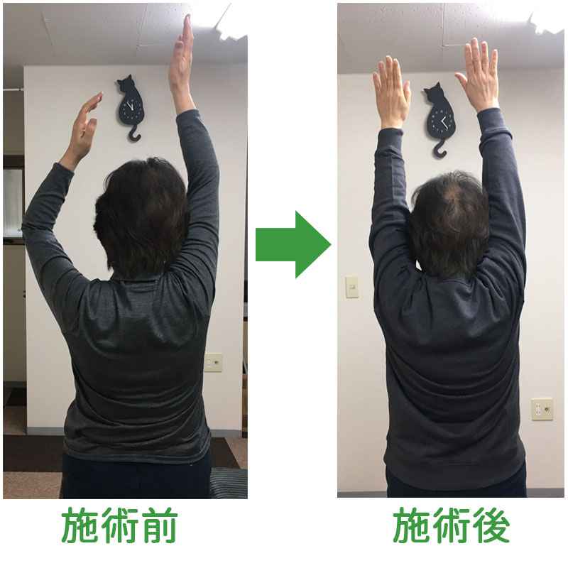 施術前後の画像1。左肩が五十肩で上がらなかったのが、右手と同じ高さ近くまで上がるようになりました。
