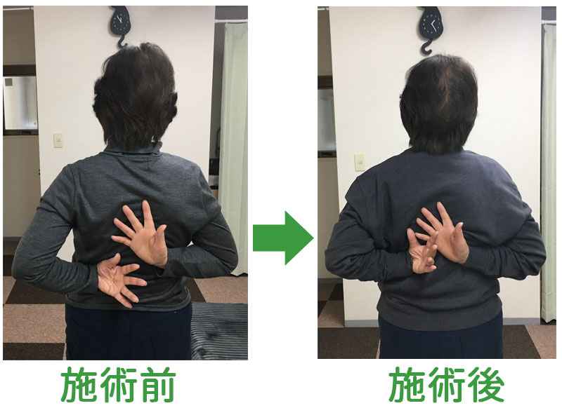 施術前後の画像2。左腕が背中まで回せず、痛みが出ていましたが、施術後は、右手近くまで上がるように。もう少しです。