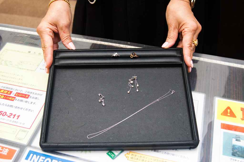 査定の様子です。ピアスなど小さなものは、ルーペを使用してチェックいたします