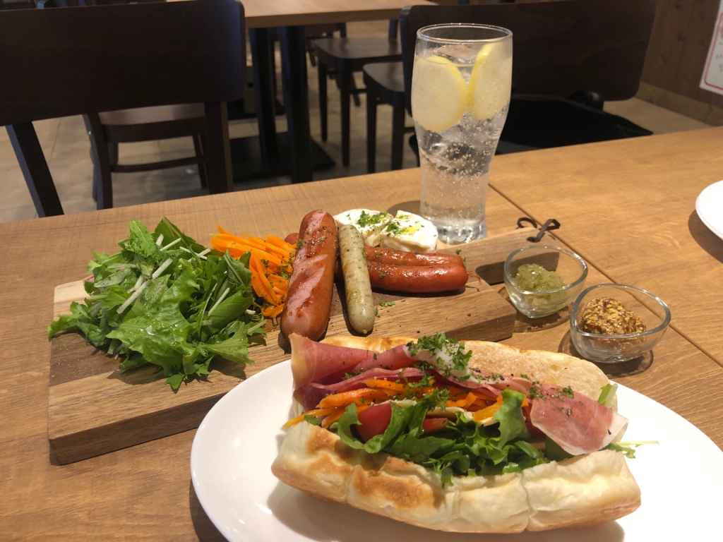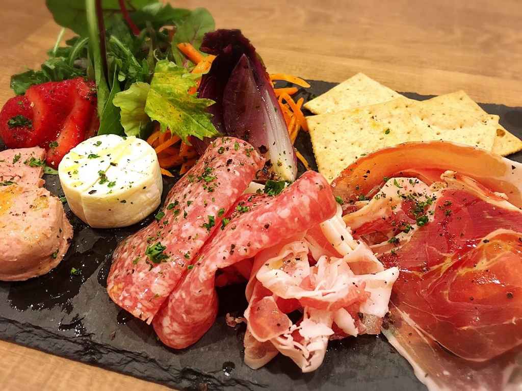 【サービス・メニュー】 12か月熟成生ハムと新鮮たっぷり野菜のサンド。レモンサワーのお供に。