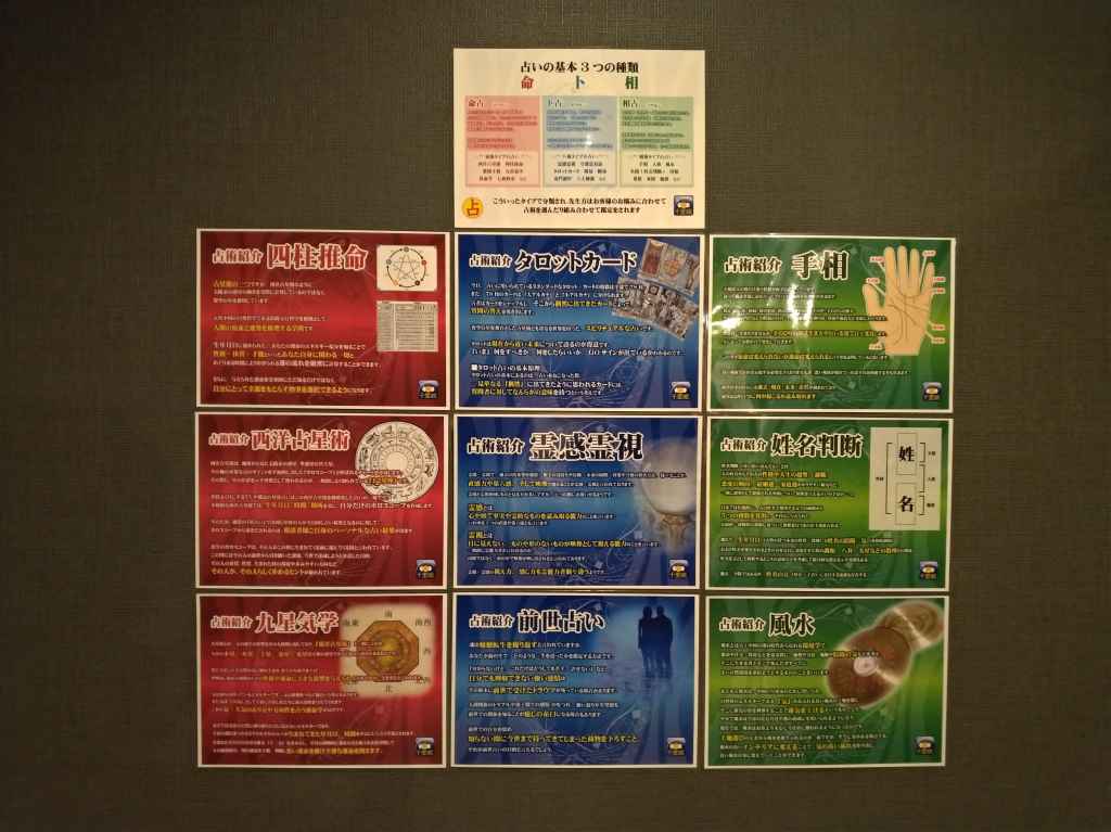 【サービス・メニュー】 多彩な占術をもつ占い師が日替わりで出演。対面占いは20分2,000円(税抜)~相談内容に応じて鑑定分数を選ぶことができる。